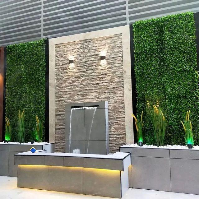 كما يُستخدم العشب الصناعي الجداري في تزيين الجدران الداخلية والخارجية، ليمنح المكان مظهرًا طبيعيًا أنيقًا دون الحاجة إلى مساحة أرضية إضافية. ويتميز العشب الصناعي بقلة تكاليف الصيانة وعدم الحاجة إلى الري أو القص، مما يجعله خيارًا مثاليًا في البيئات ذات المناخ الحار والجاف.