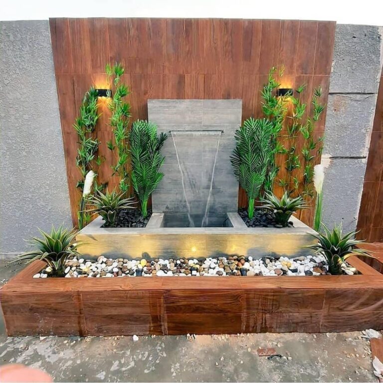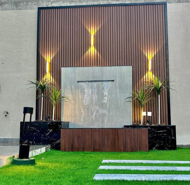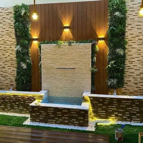 دمج الشلالات والنوافير مع الجلسات الخارجية والعشب الطبيعي أو الصناعي